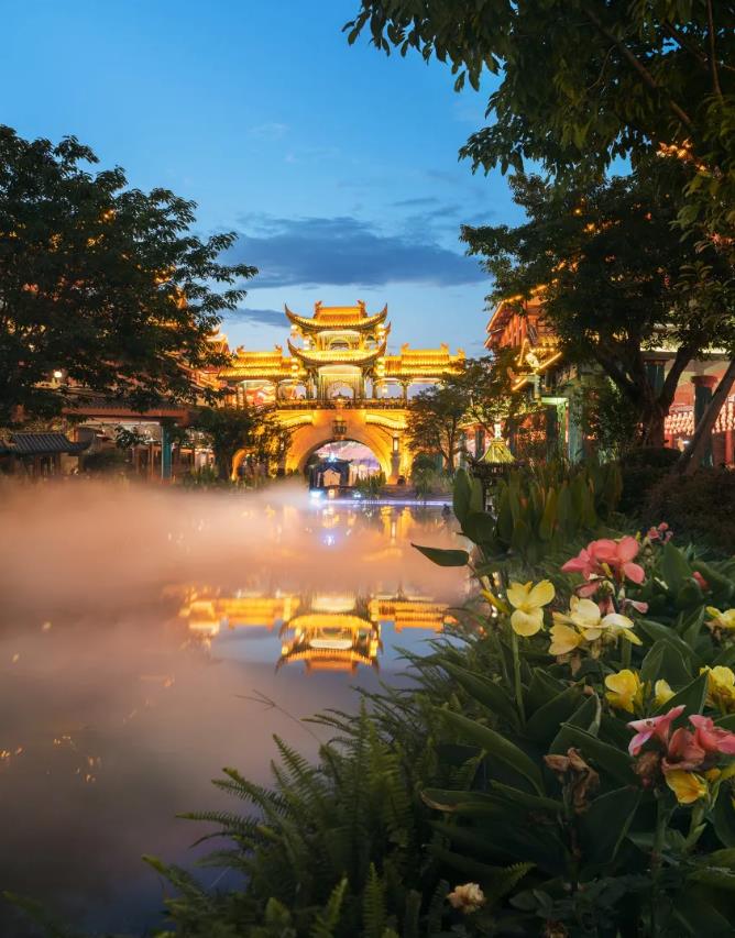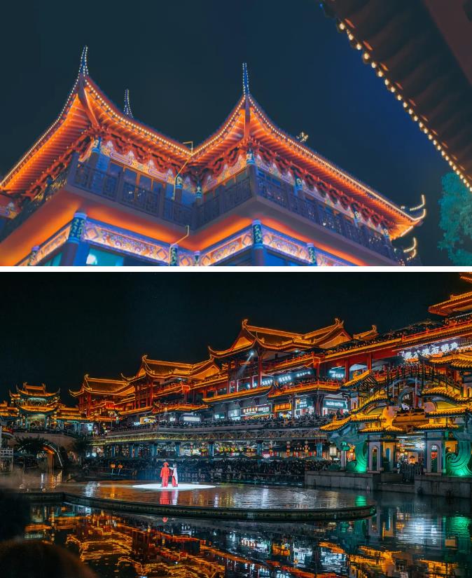 点开刷屏的视频的一瞬间,旅行菌还以为这是假期人流爆满的大唐不夜城。点开评论区才知道,这是属于四川人的“大宋不夜城”。这条如梦如幻的街道在四川省眉山市,真正的名字叫东坡印象水街。整个街道在设计上融合了眉山的文化、人文及自然山水,以丽江滨水风情为蓝本,结合东坡文化,承载了宋代建筑风格的底蕴。水街分为三段:东坡里,穿越盛世和东坡印象,总长约1500米左右。青石板铺路,两侧是精雕细琢的牌楼,每一处都透着古朴的气息,让人心生喜爱。街区内还有诸多博物馆、文物陈列馆和苏轼纪念馆等,一边游览美景,一边了解传统文化,意义非凡。灯光沿着建筑边缘一直延绵开来,花灯浮在湖面,古色古香的建筑在夜色中显得更加迷人。来到四川当然少不了打卡地方特色美食,这里饭馆、小吃应有尽有,可以放心品尝,都很好吃。大家可以游船慢慢欣赏两岸华丽的街景,也可以找一家酒吧,坐下来喝杯小酒,吹着凉风,格外惬意。