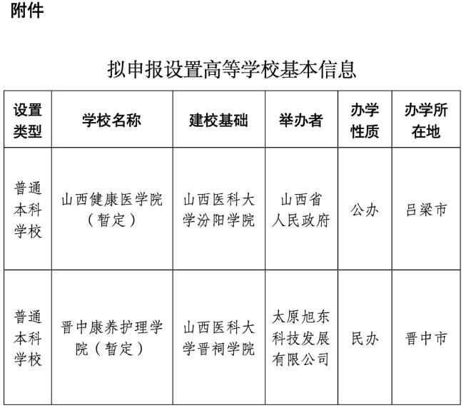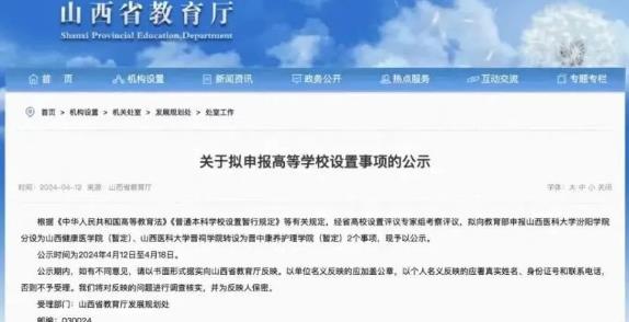 4月12日,山西省教育厅发布关于拟申报高等学校设置事项的公示,拟向教育部申报山西医科大学汾阳学院分设为山西健康医学院(暂定)、山西医科大学晋祠学院转设为晋中康养护理学院(暂定)2个事项,予以公示。