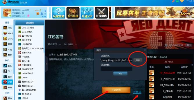 3.在游戏大厅内,找一个人较多的房间双击进入,进入房间后,先设置游戏路径:点击浏览按钮,找到安装在电脑里的红警游戏文件---RA2.exe(比如红警安装在 D盘某个文件夹中,那就去那个文件夹里找),设置好游戏路径后,点击开始游戏