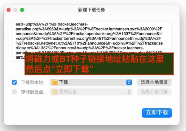 2、将磁力/种子/电驴链接粘贴到任务输入框,然后点“立即下载”