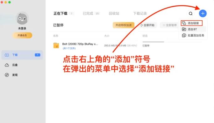 1、打开迅雷,点击右上角的+号,选择“添加链接”