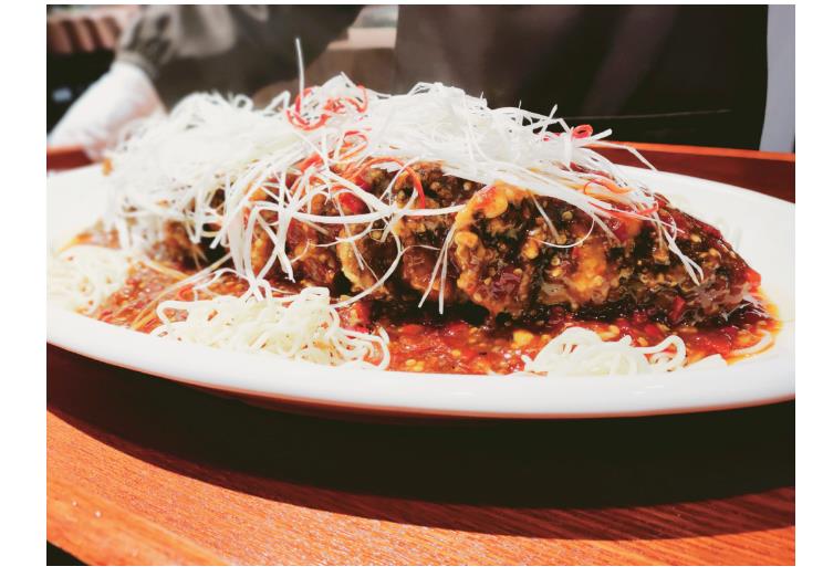 文中特别指出:“如有香菜时,可配合葱丝、辣椒丝一同撒在鱼身上面,更增一色。”还特别提醒:“北方人吃此菜,可以少放或不放泡辣椒。”对不嗜辣的外地客人关怀备至,溢于言表。这可能是后来脆皮鱼为了提红色,又不突出泡辣椒的辣味,而改用番茄酱的原因吧,也有直接放弃泡辣椒和番茄酱提色,体现本色的糖醋脆皮鱼。