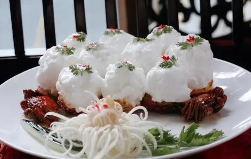 雪花蟹斗是在芙蓉蟹的基础上创制的一款名菜。利用蟹壳的原形,借雪花之洁白突出此菜色、形、味,使人倍感蟹鲜蟹味之浓郁