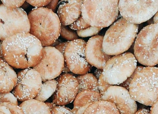 黄山烧饼的制作工艺非常复杂,先要把面团反复揉面,擀成面饼,再均匀的涂抹上油酥,卷成卷后,揪成小剂子,再包入梅干菜和肥膘肉调成馅儿,刷上菜籽油,撒上芝麻,烤制而成。做好的黄山烧饼,金黄诱人,小巧玲珑,酥脆香浓,梅干菜吸满了油脂,吃起来肥而不腻,每一口都是对味蕾的极致享受。